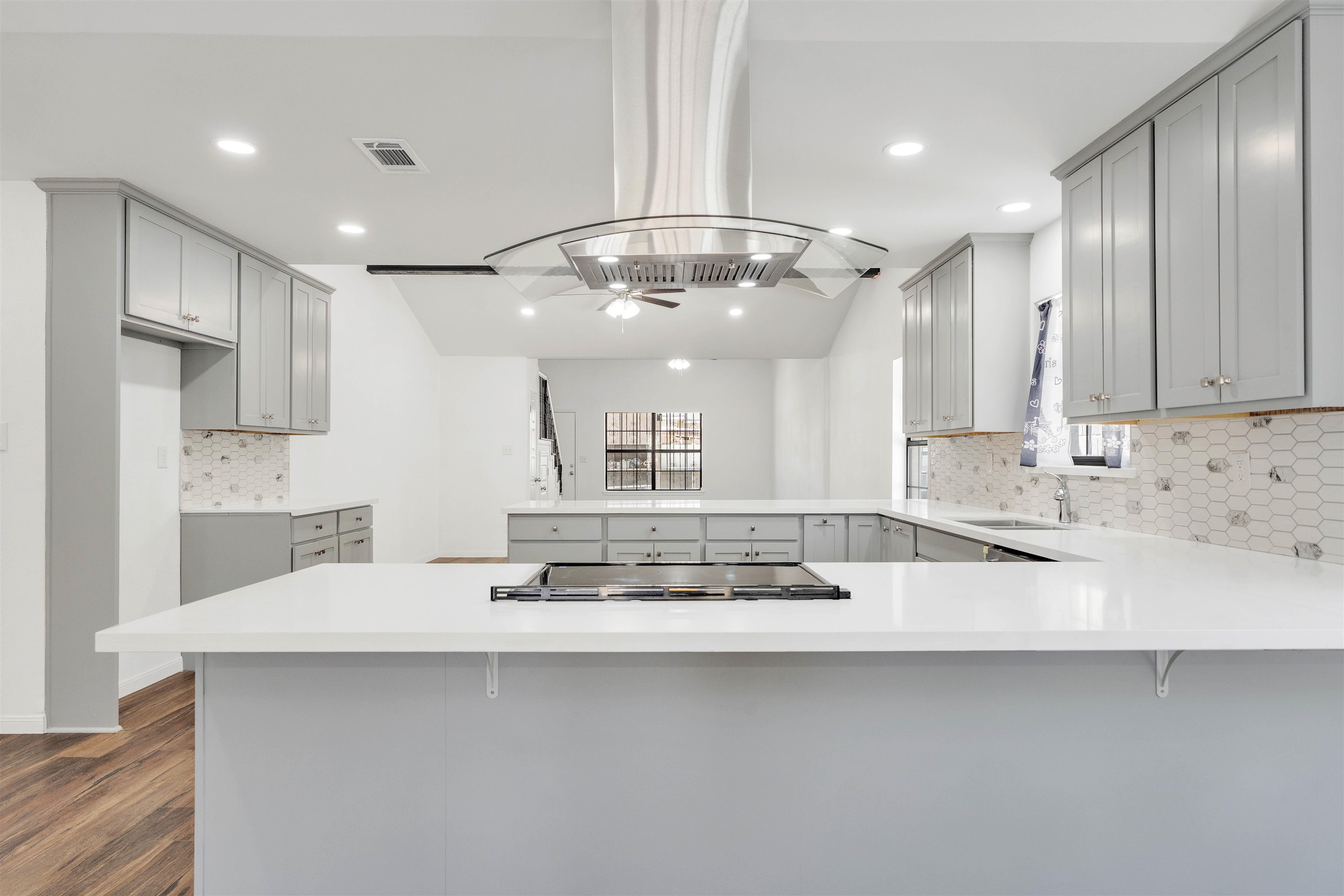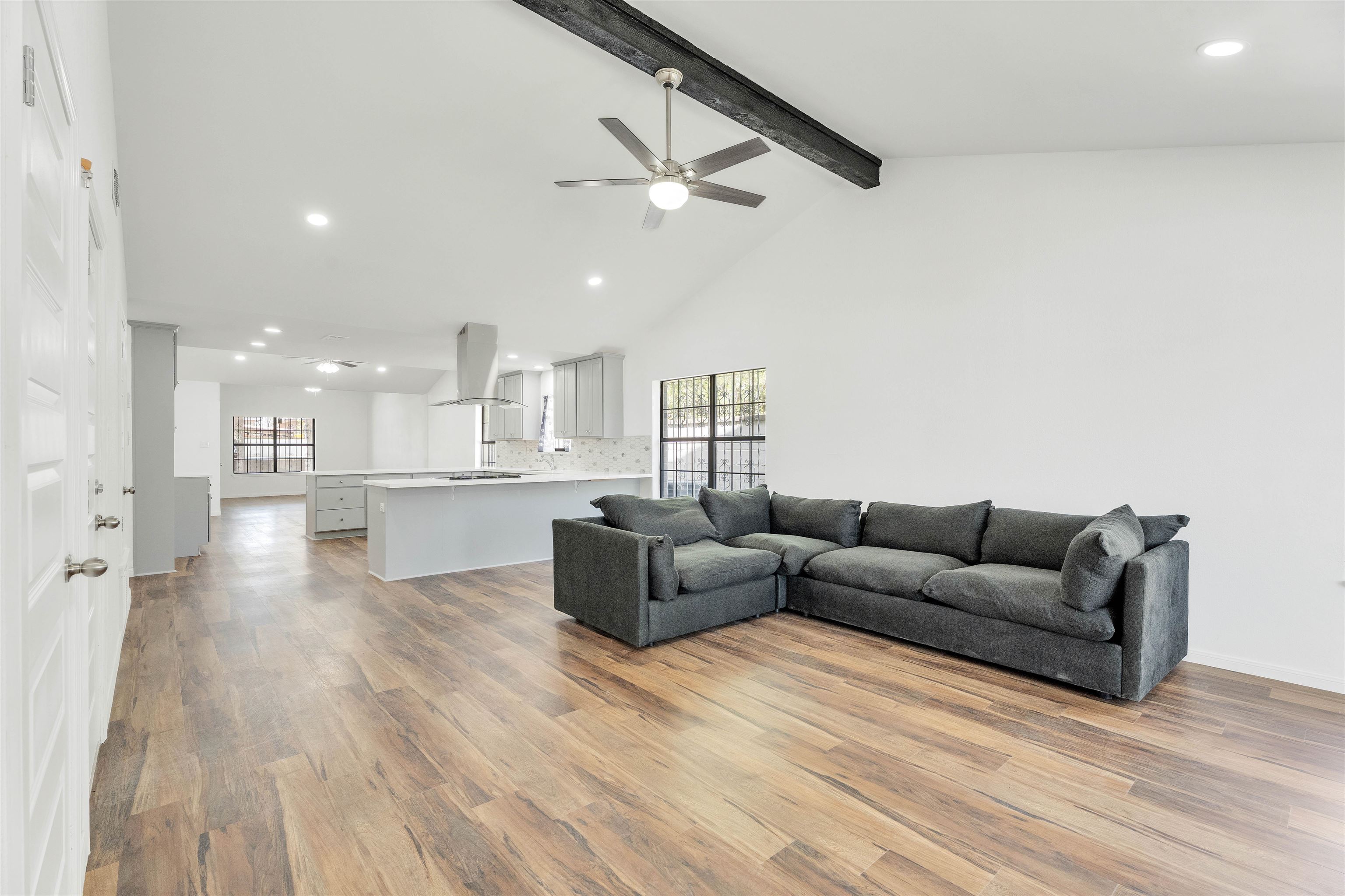 This beautifully remodeled five-bedroom home with a study and three full baths offers a thoughtfully designed open-concept layout. New flooring, soaring ceilings with exposed beams, and a spacious living area that flows seamlessly into the heart of the home—a wide, inviting kitchen centered around a large peninsula, perfect for gathering and everyday meals. Situated on a desirable corner lot: features a block privacy fence, a double-car garage, and a covered patio with a built-in grilling station.