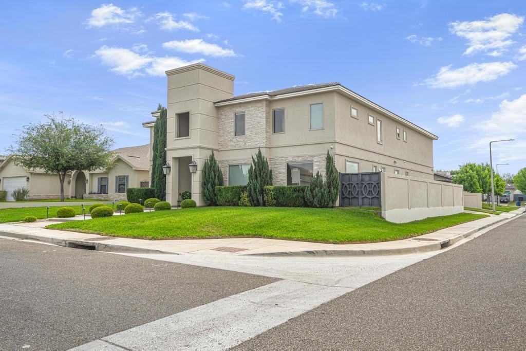 Stunning two-story home on a corner lot in Alexander Subdivision. Features porcelain tile and wood flooring, quartzite countertops, Pella windows, gas cooktop, butler’s pantry, movie theater, surround sound throughout most rooms including patio, automated interior/exterior blinds, and tankless water heater. Enjoy a heated pool, outdoor kitchen, balcony, tile roof, sprinkler system, and spacious bedrooms with walk-in closets.